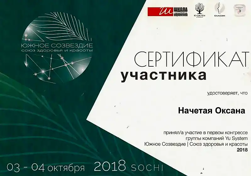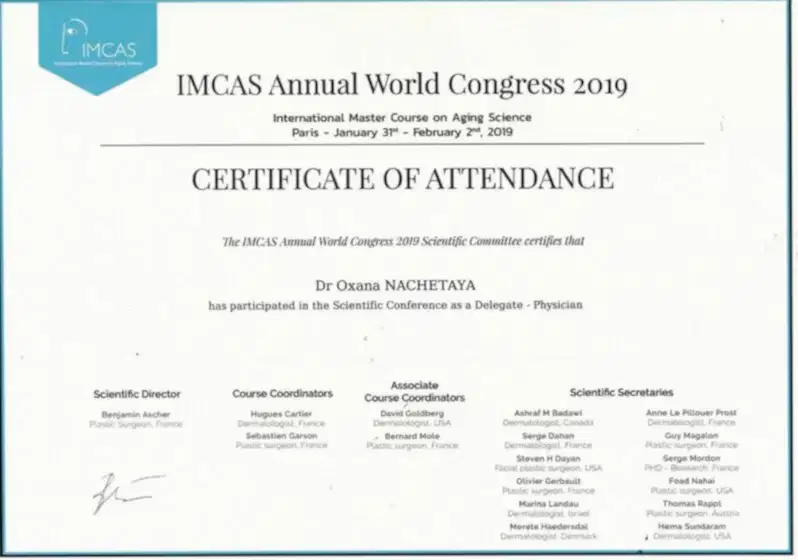 2019 г. Участник всемирного конгресса косметологов IMCASг. Paris