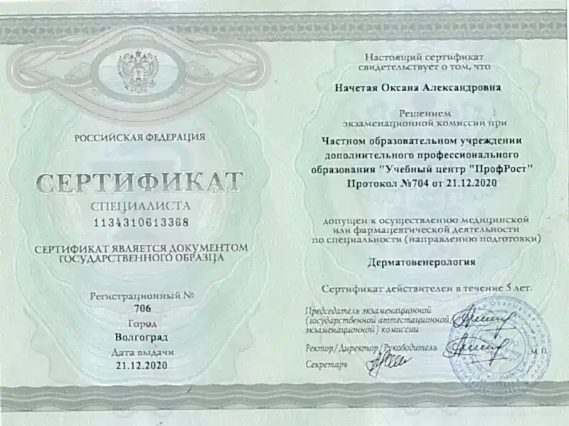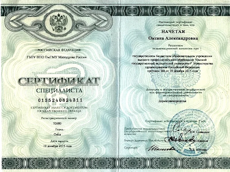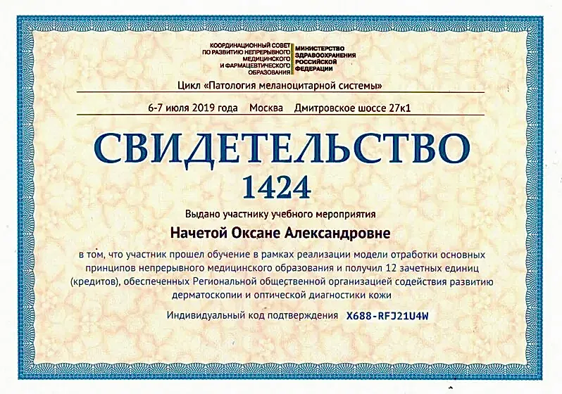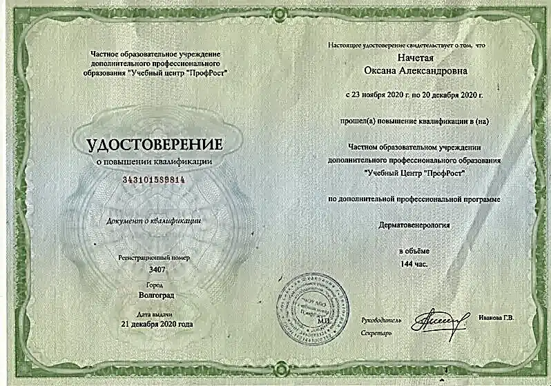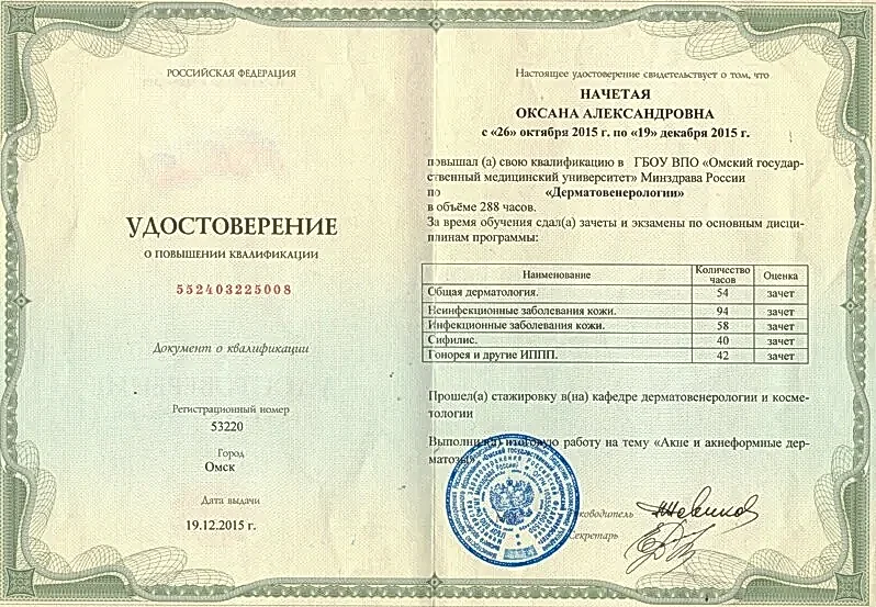 2015 г. Повышение квалификации по специальности «Дерматовенерология»