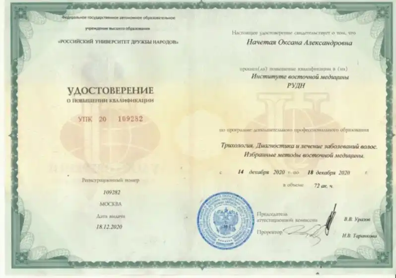 2020 г. Повышение квалификации по трихологии. Диагностика и лечение заболеваний волос у профессора Ткачёва. Алматы