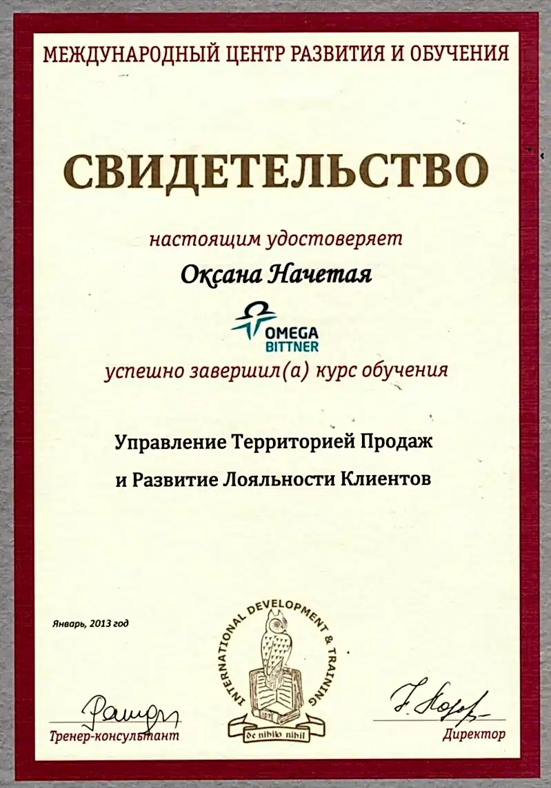 2013 г. Обучение «Управление Территорией продаж и Развития лояльности клиентов»