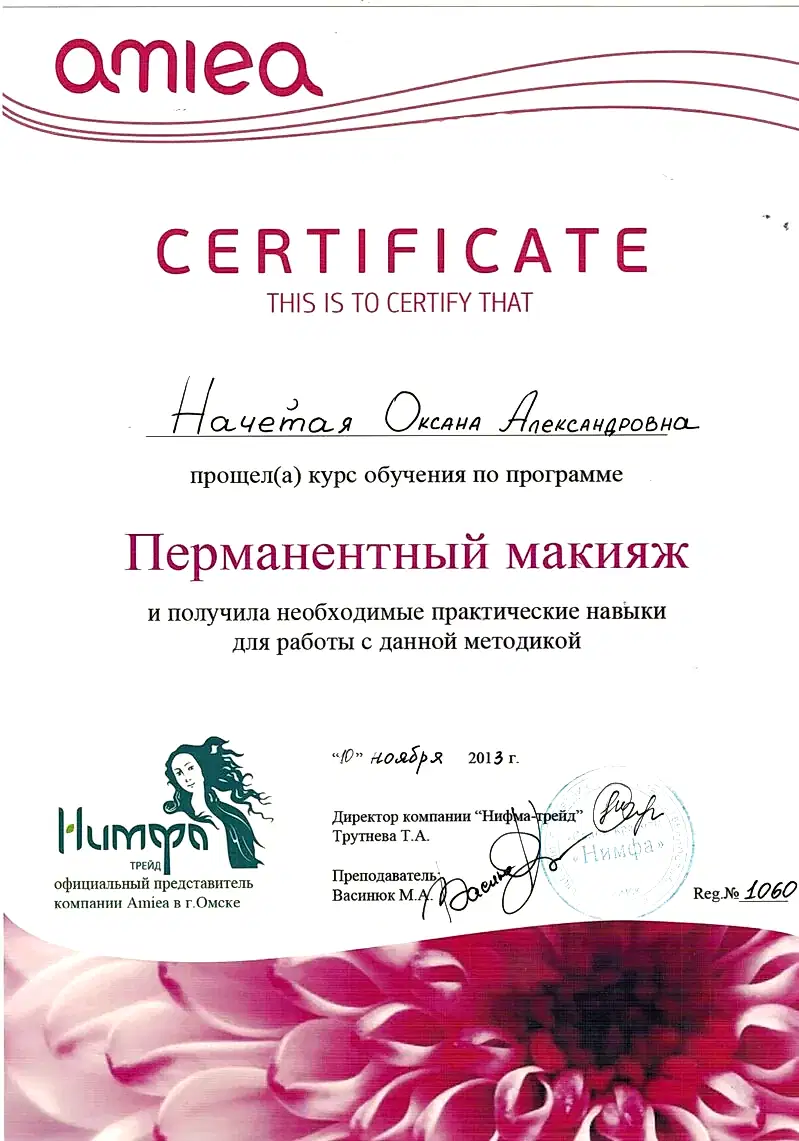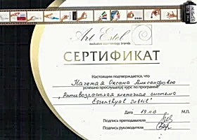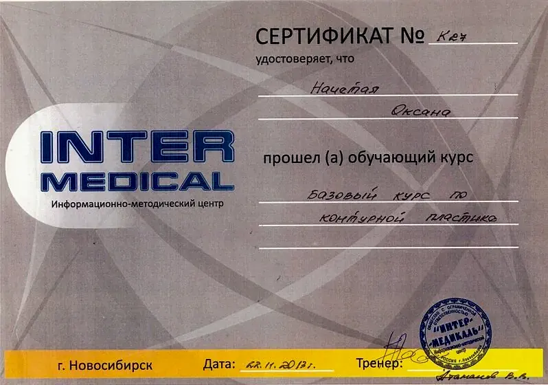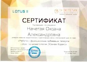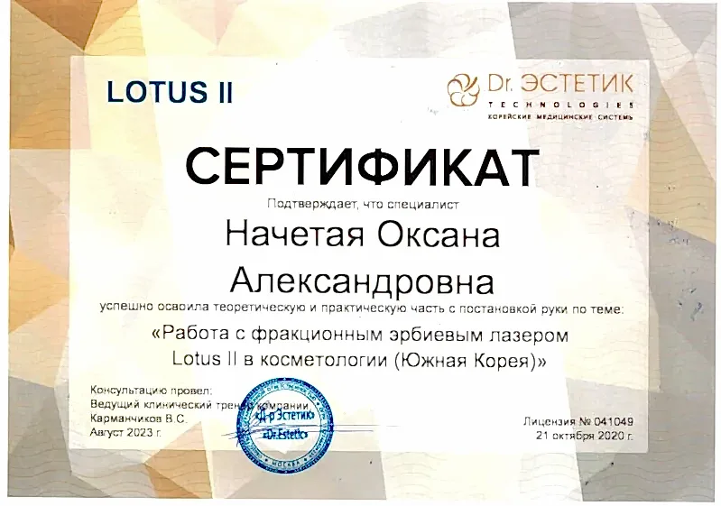 2023 г. Прошла и освоила теорию и практику с постановкой руки на фракционном эрбиевом лазере LotusII в косметологии