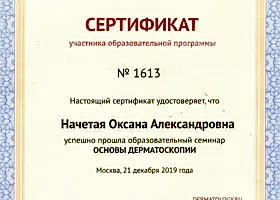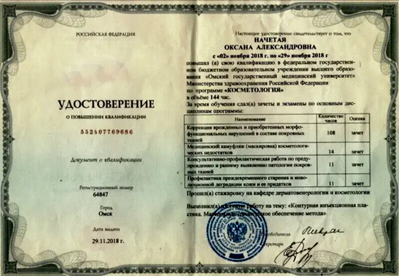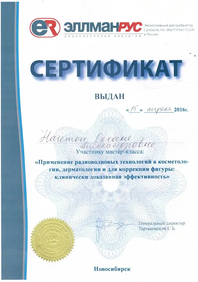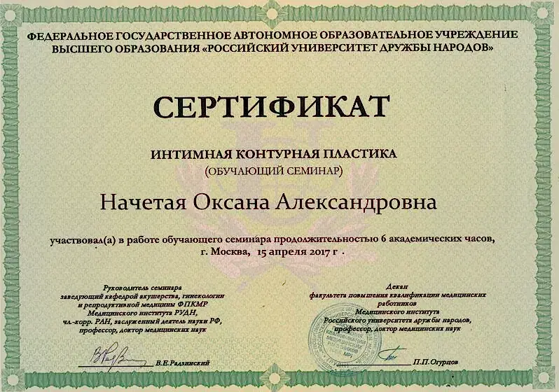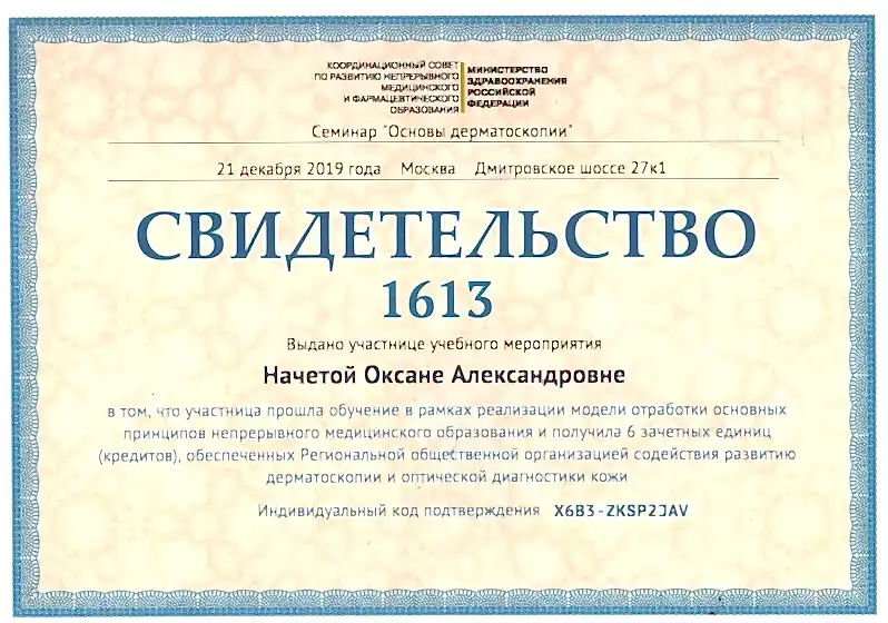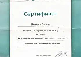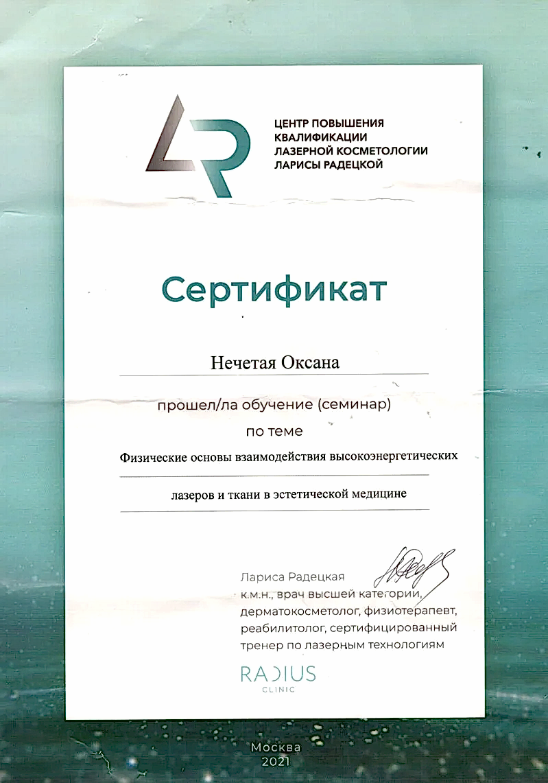 2021 г. Обучение по «Физическим основам взаимодействия высокоэнергетических лазеров и ткани в эстетической медицине» . Центр повышения квалификации Ларисы Радецкой