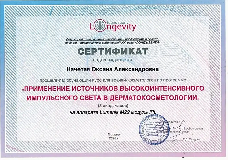 2020 г. Обучающий курс для врачей косметологов по программе «Применение источников высокоимпульсного света в дерматокосметологии на аппарате Lumenis M22 модуль IPL