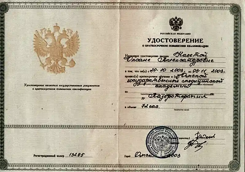 2003 г. Краткосрочное повышение квалификации по «Лазеротерапии»