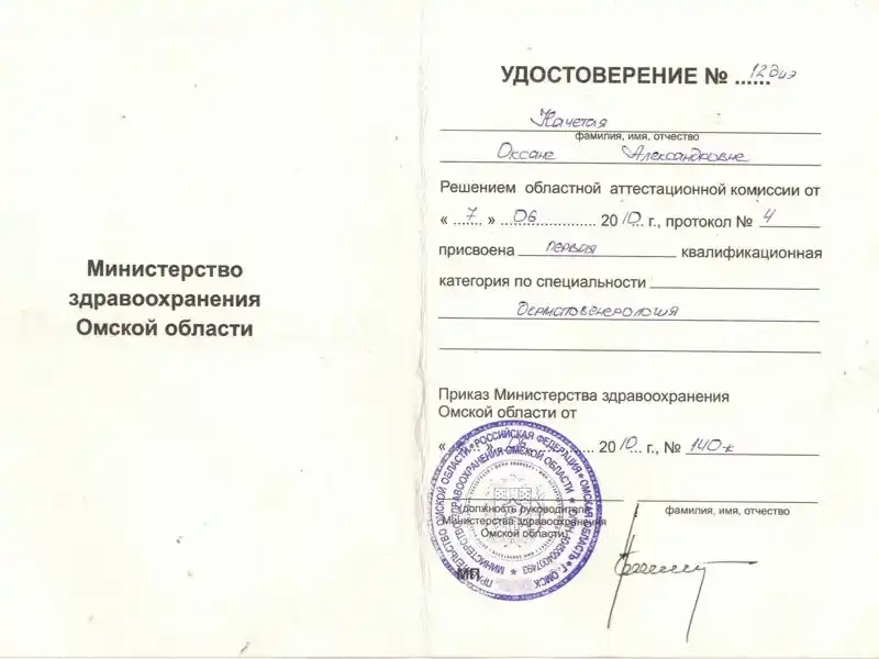 2010 г. Присвоена первая квалификационная категория по специальности «Дерматовенерология»