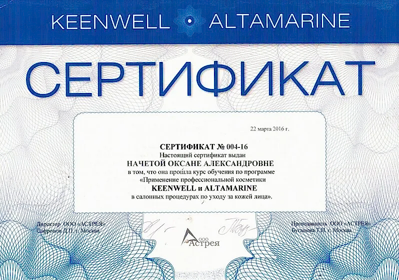 2016 г. Курс обучения по программе «Применение KEENWELL в салонных процедурах по уходу за кожей лица»