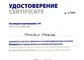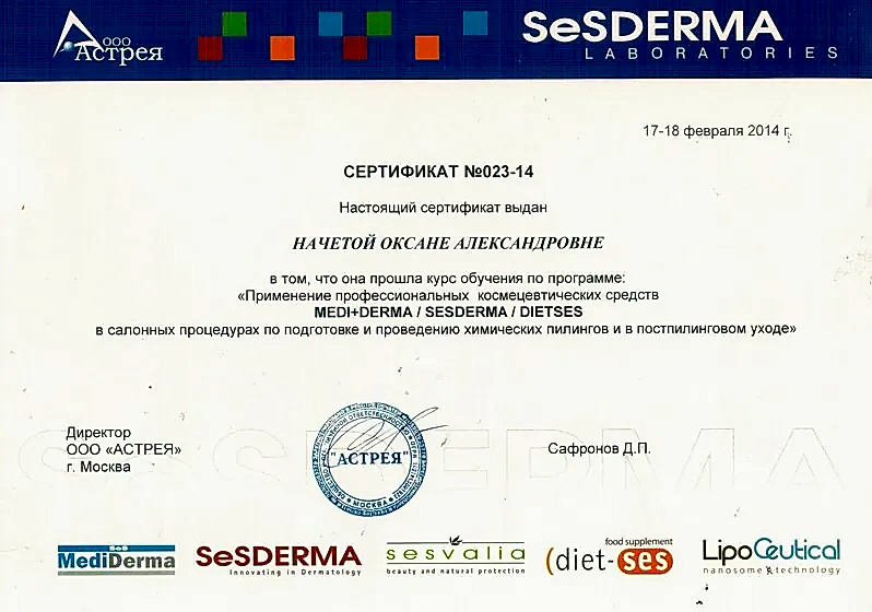 2014 г. Курс обучения по программе : «Применение профессиональных космецевтических средств MEDI+DERMA/SESDERMAв салонных процедурах по подготовке и проведению химических пилингов