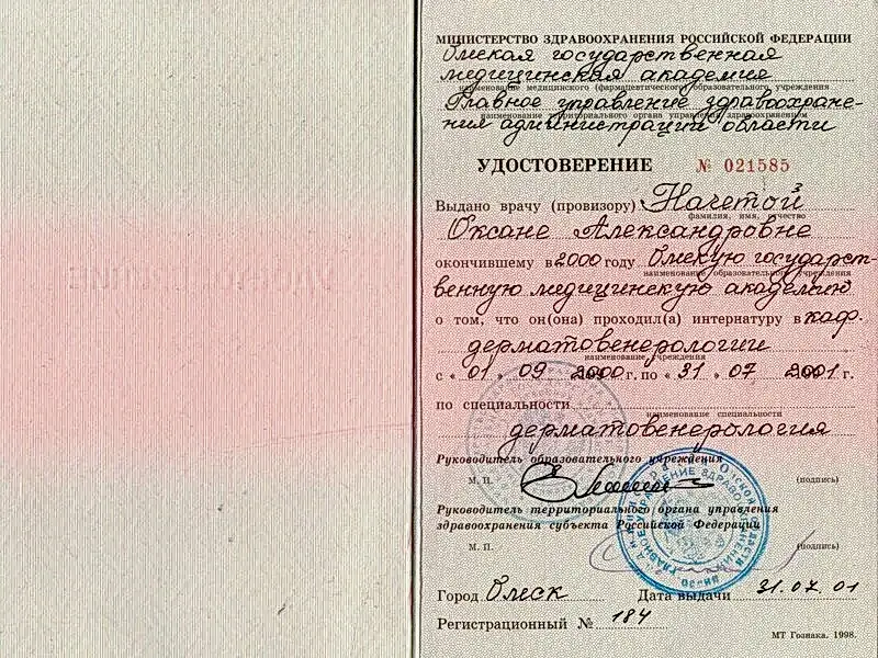 2001 г. Интернатура по Дерматовенерологии на кафедре «Кожных и венерических болезней» ОГМА