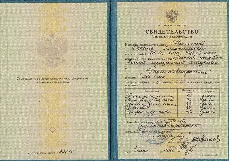 2010 г. Повышение квалификации по специальности «Дерматовенерология